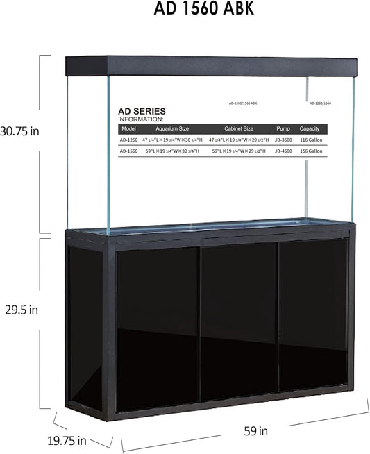175 Gallon Glass Aquarium with Aluminum Cabinet - Including Sump for Filtration and Circulation, Plumbing, LED, Black